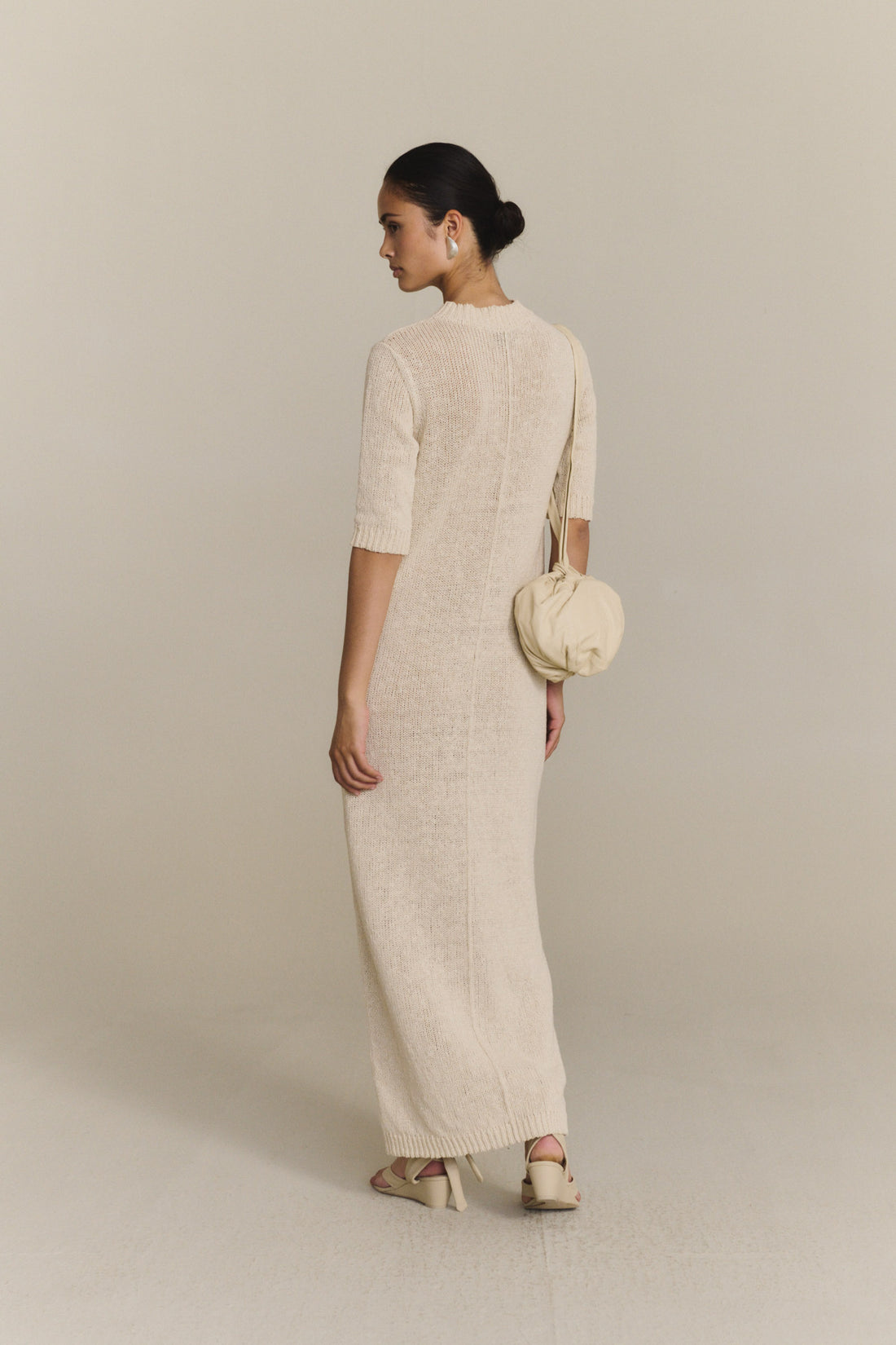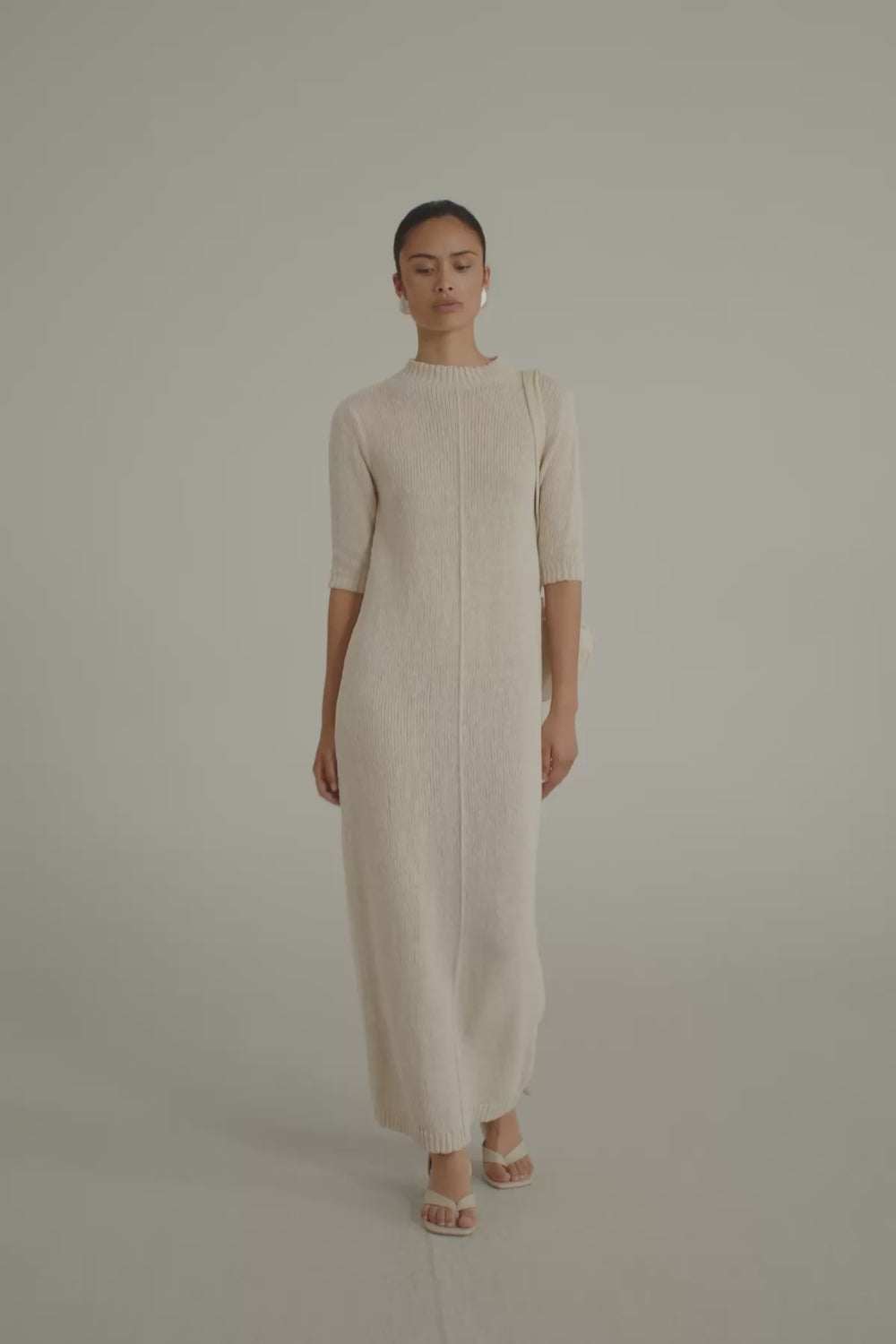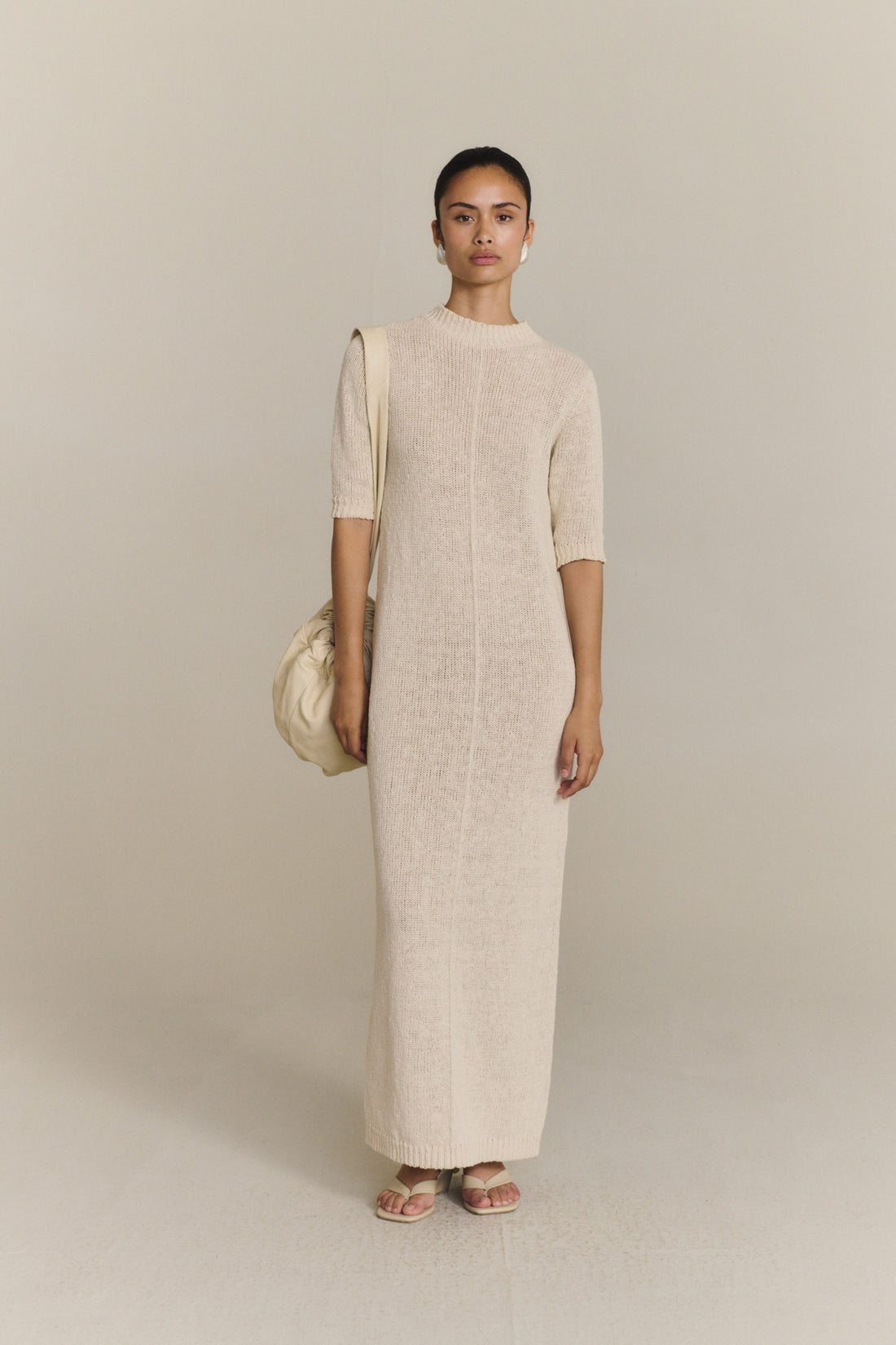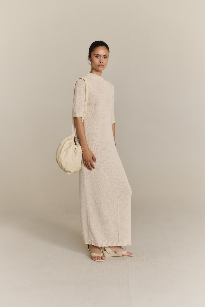 El hilo utilizado combina algodón, lino y seda reciclada. Puede generar irregularidades naturales que le dan un aspecto único a cada prenda. Estas particularidades forman parte del encanto y la autenticidad de este diseño único.