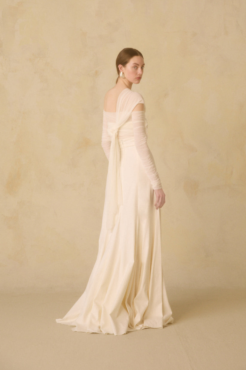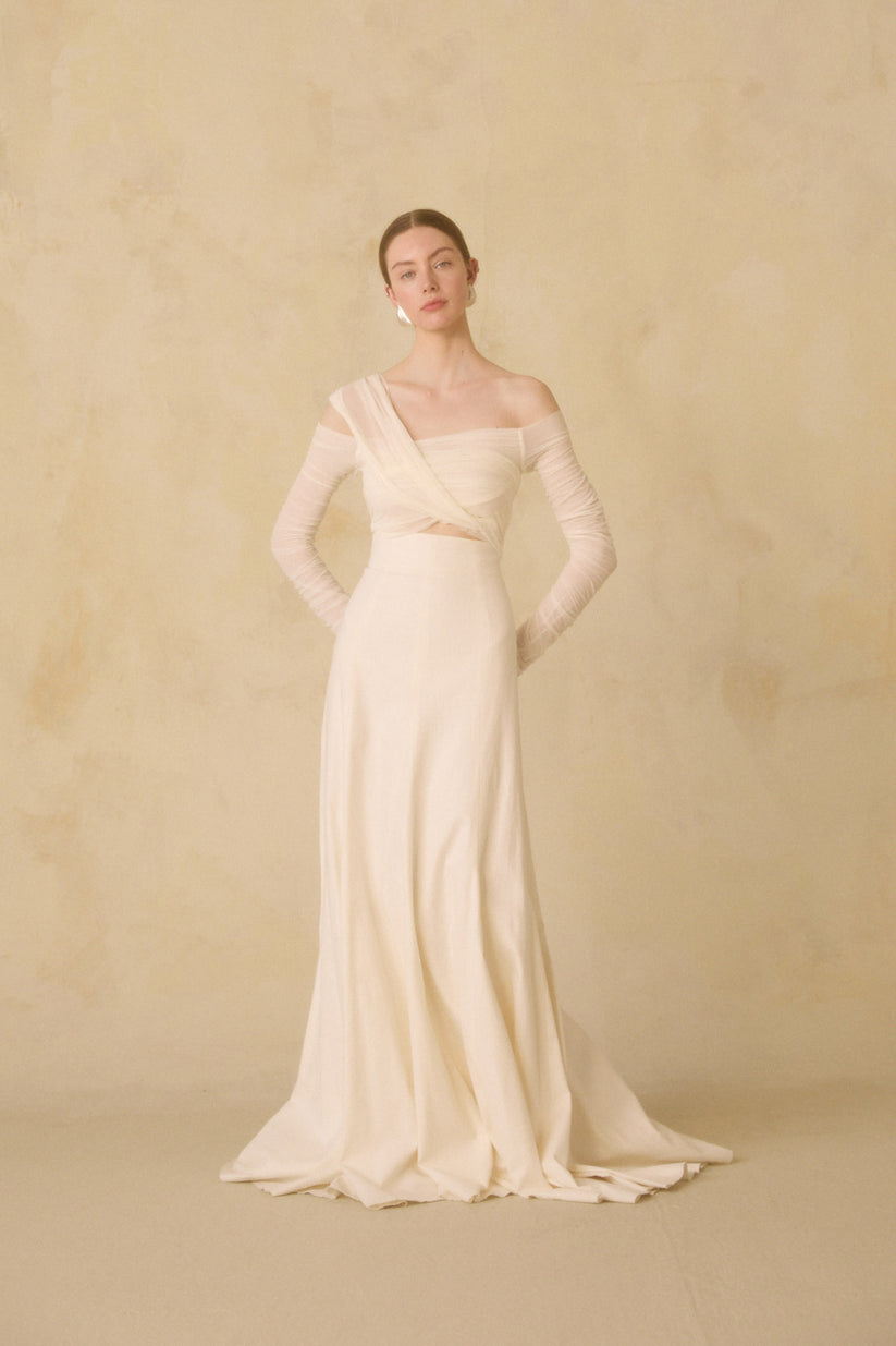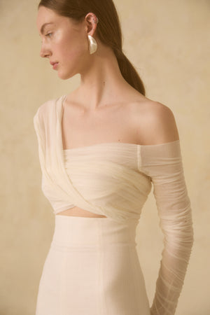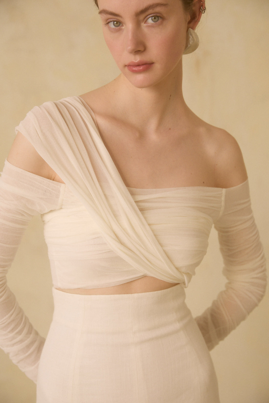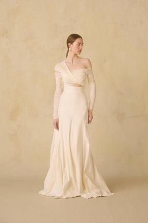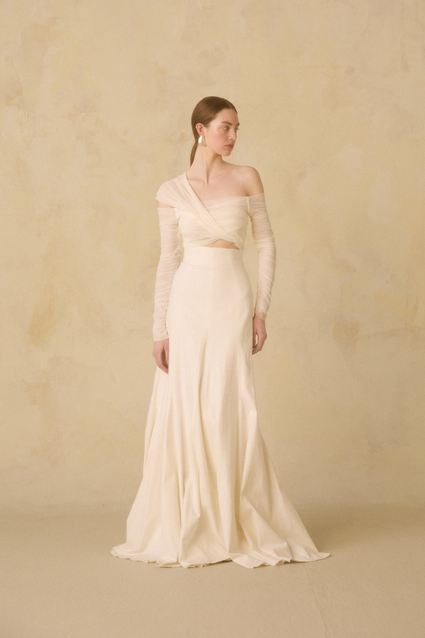 Tula, crop top envolvente realizado en tul de seda stretch. Este top tiene dos tiras de tul a cada lado que permite llevarlo de diferentes formas. Falda Esparta de talle alto realizada en lino stretch y con forro de satén stretch. Este modelo lleva varios godets de organza de seda para un mayor volumen.