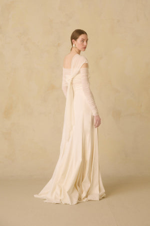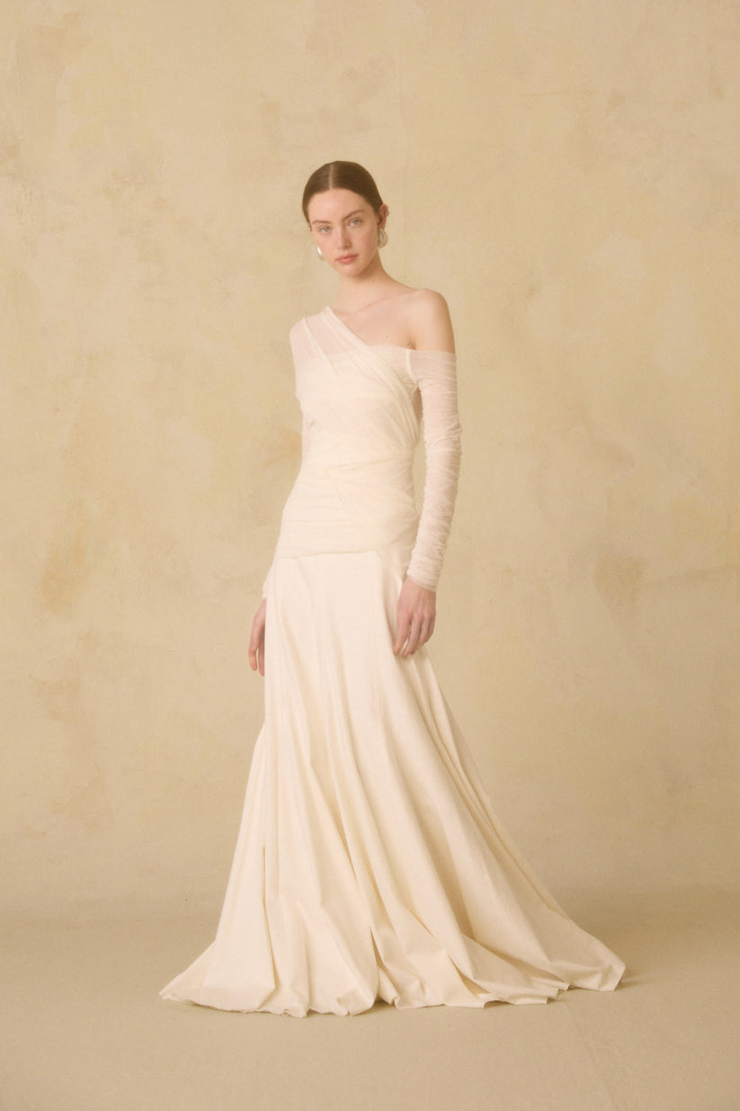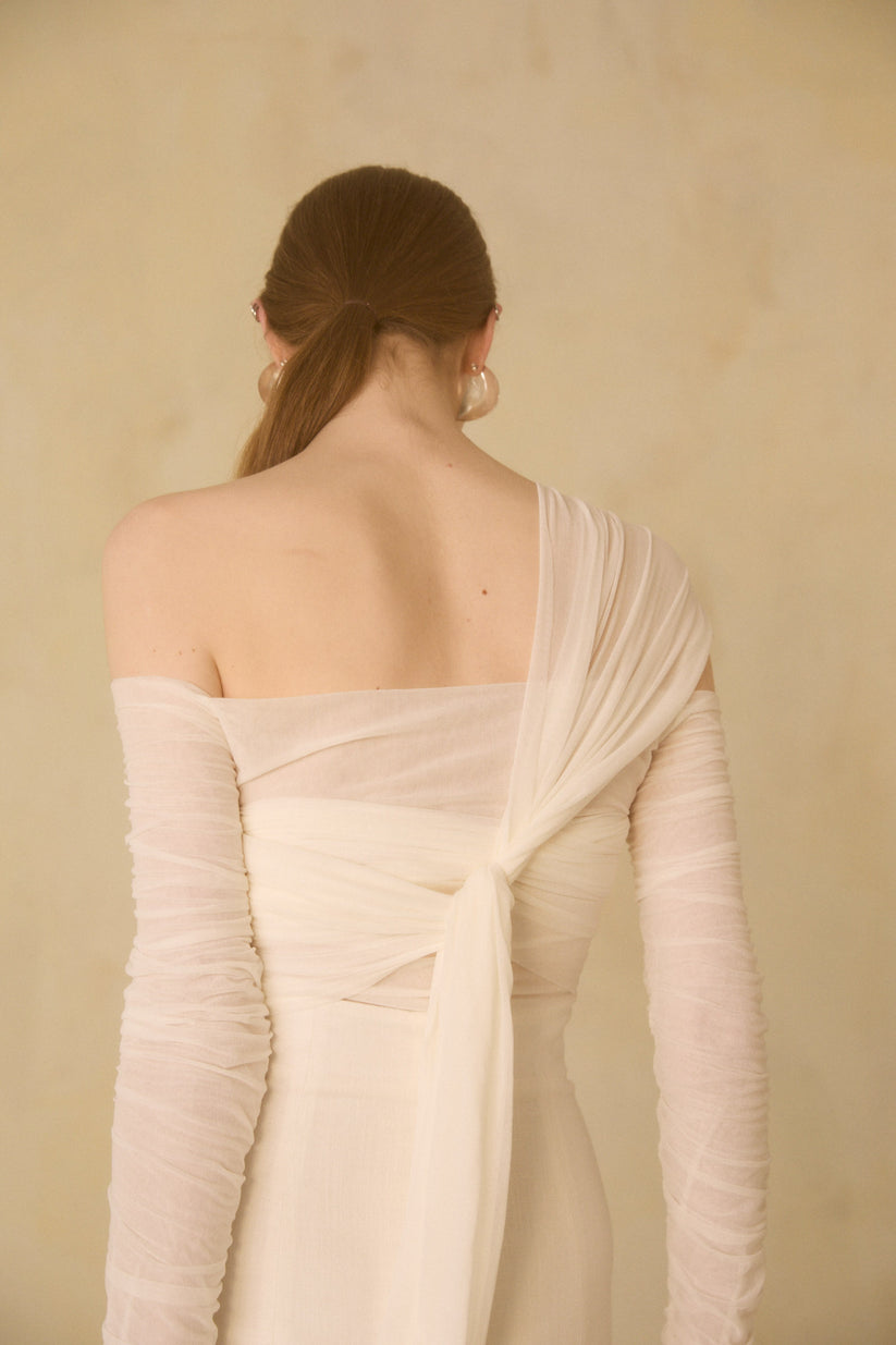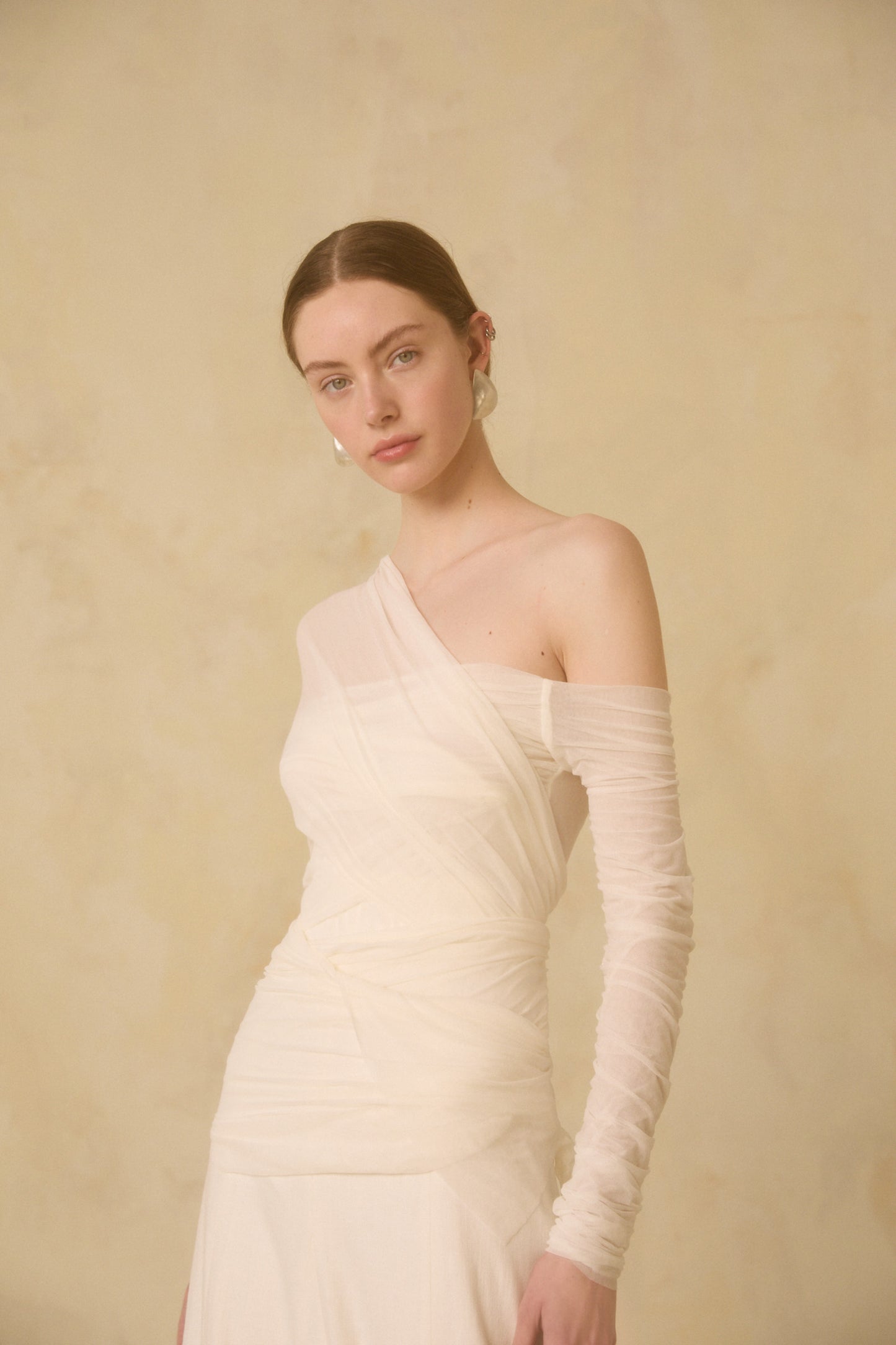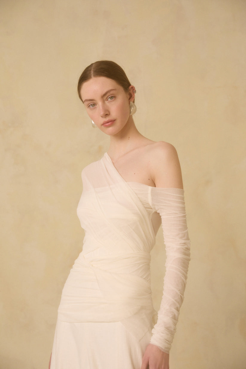 Tula, crop top envolvente realizado en tul de seda stretch. Este top tiene dos tiras de tul a cada lado que permite llevarlo de diferentes formas. Falda Esparta de talle alto realizada en lino stretch y con forro de satén stretch. Este modelo lleva varios godets de organza de seda para un mayor volumen.