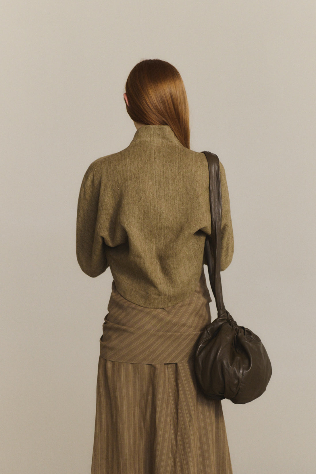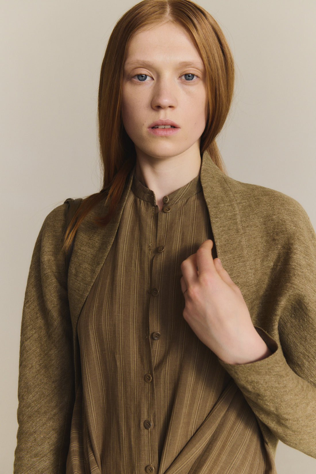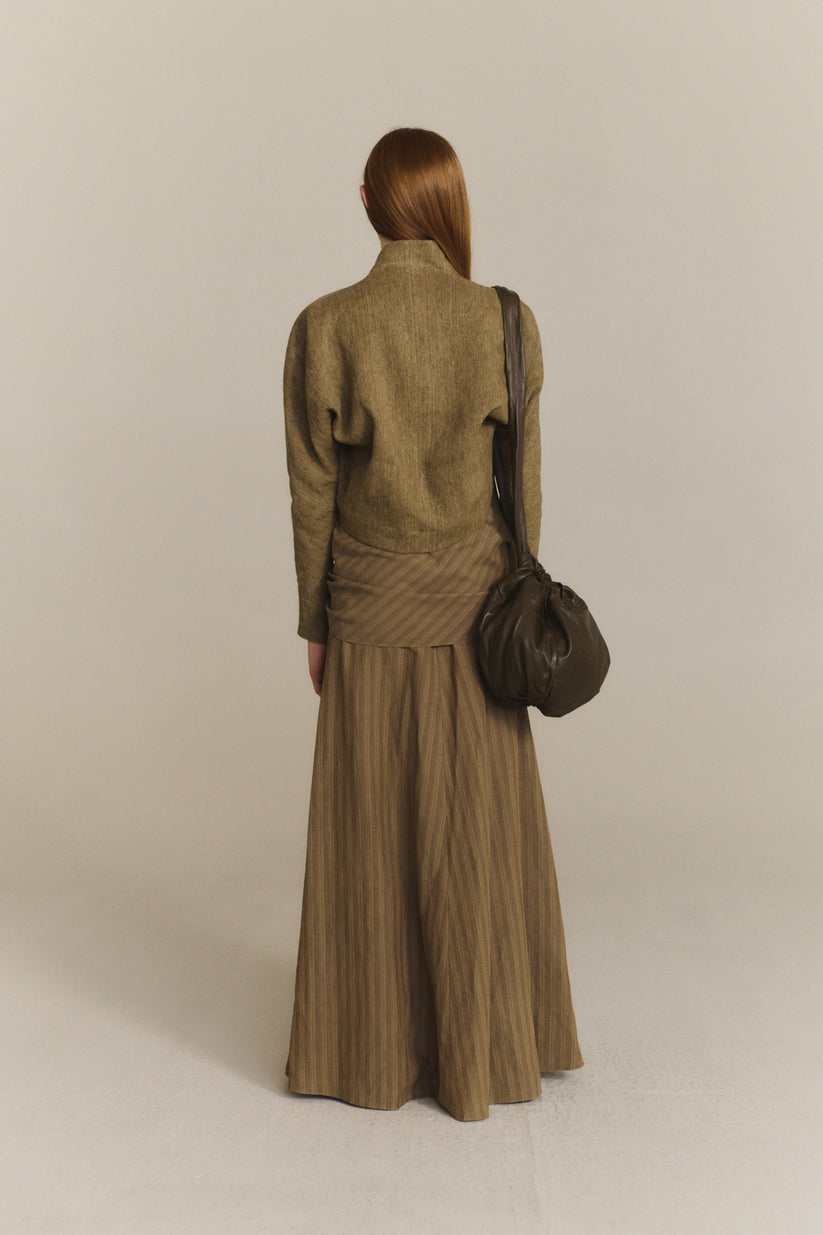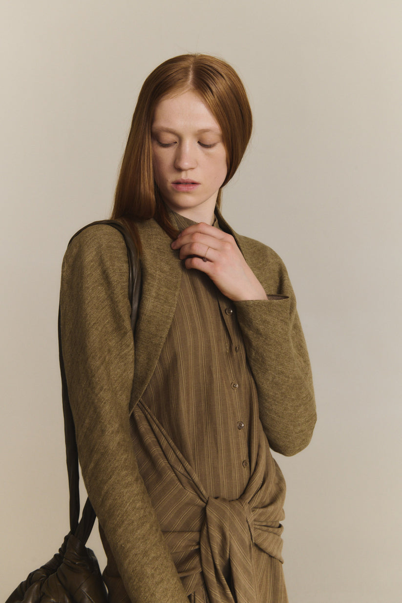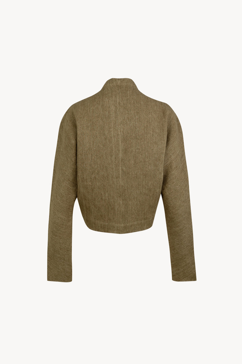 Chaqueta corta realizada en un tejido jacquard de lino grueso, con cuello kimono y manga japonesa.
