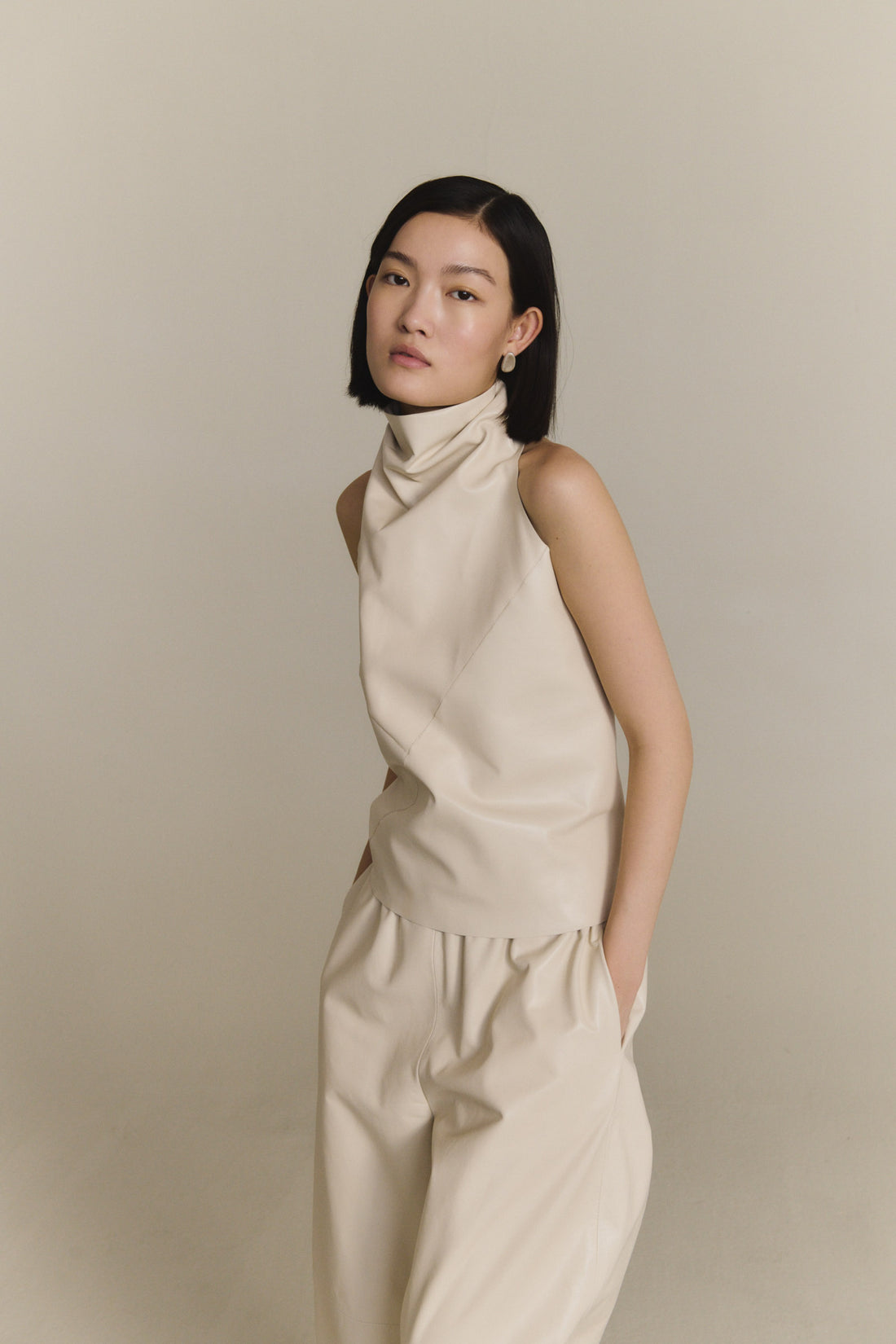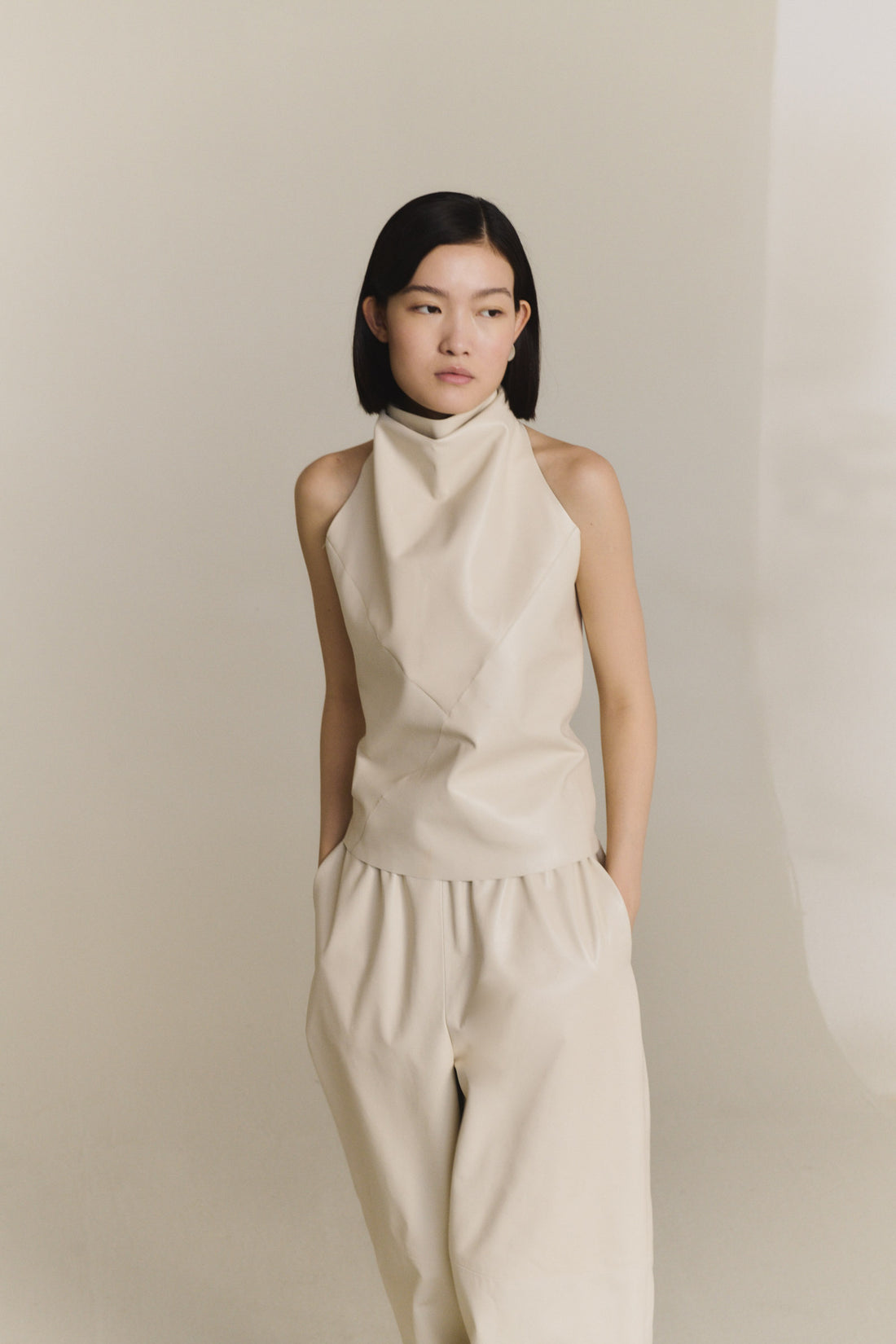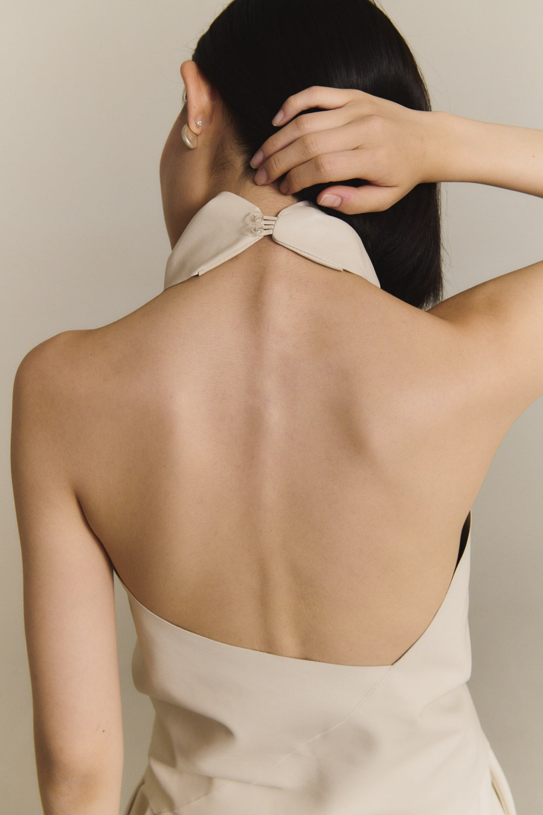 Top halter realizado en piel de cordero. El top Tulip tiene un cierre en el cuello mediante dos botones. Cada pieza se confecciona en España, en talleres especializados, con un enfoque artesanal y una cuidada selección de materiales.